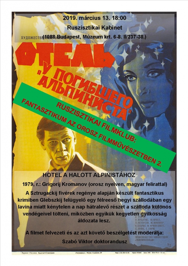2019. március 13-án 18 órakor egy 1979-es szovjet sci-fi vetítésével folytatódik a Ruszisztikai Filmklub. A "Hotel a Halott Alpinistához" izgalmas és egy kicsit borzongató krimi. Senkit ne riasszon el, hogy 13-án vetítjük! Várjuk régi és új nézőinket!