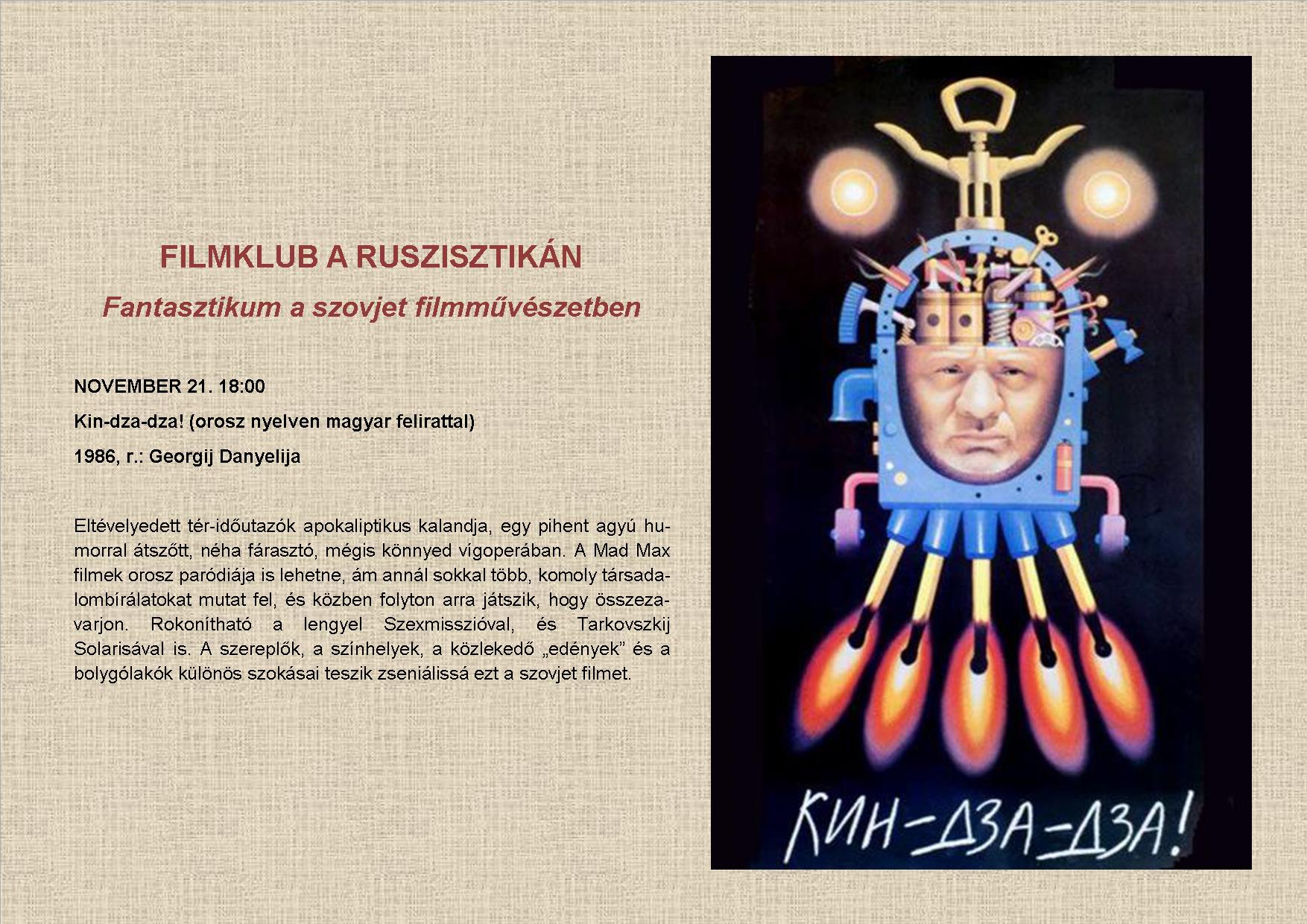 Aki érti a címet, annak nem kell reklámozni, aki nem érti, annak pedig jó szívvel ajánljuk a figyelmébe a peresztrojka küszöbén készült "Kin-dza-dza" című szórakoztató szatírát, ami a szovjet társadalom karikatúráját rajzolja meg érdeklődő földönkívüliek szemszögéből. Műsoron lesz 2018. november 21-én 18 órától a ruszisztikai filmklubban.