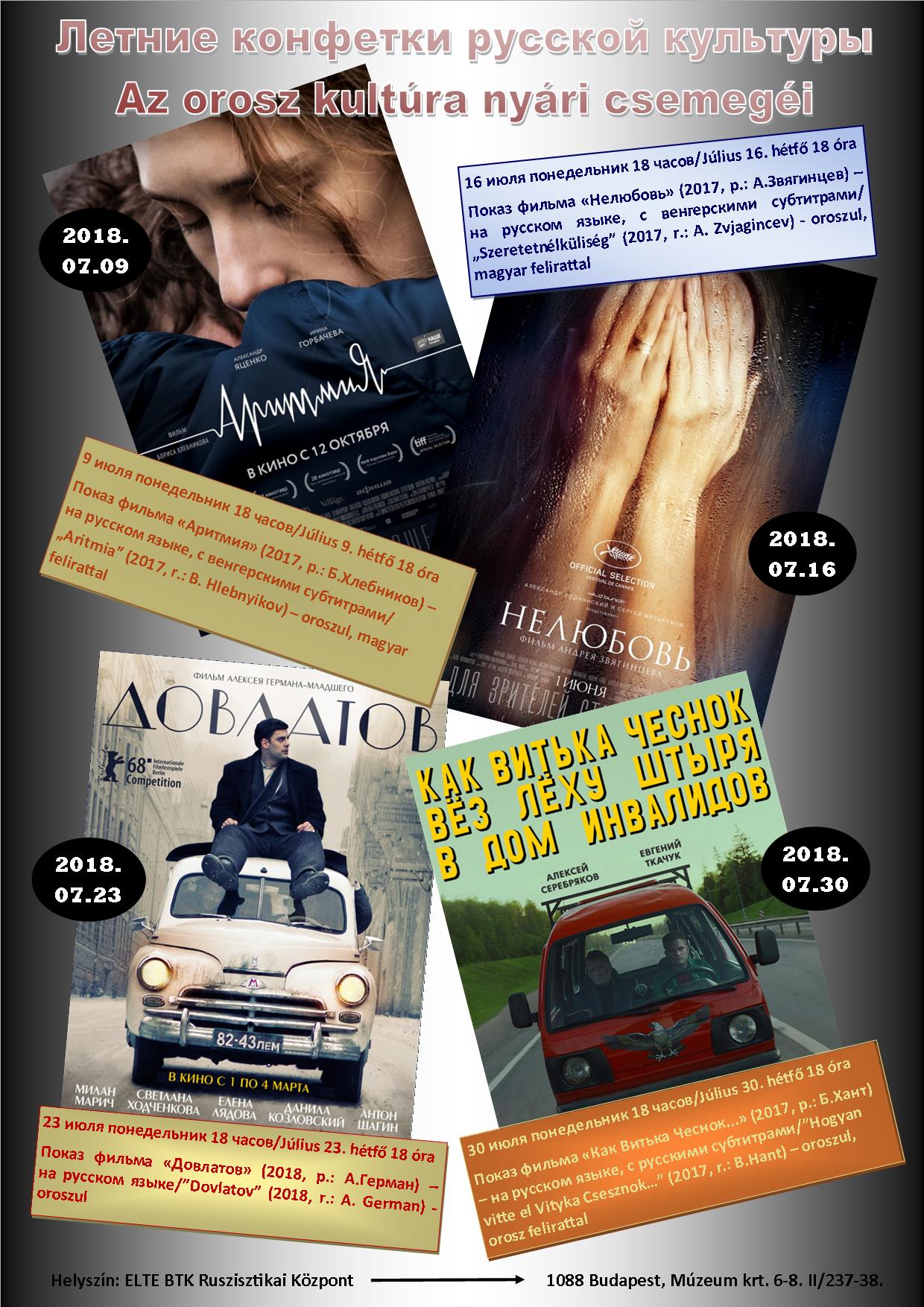 A Ruszisztikai Kutatási és Módszertani Központ és a Ruszisztikai Kabinet idén is meghirdeti "Az orosz kultúra nyári csemegéi" című programsorozatát. Négy új orosz játékfilm kerül bemutatásra, amelyek az orosz filmgyártás különböző szegmenseit képviselik.
