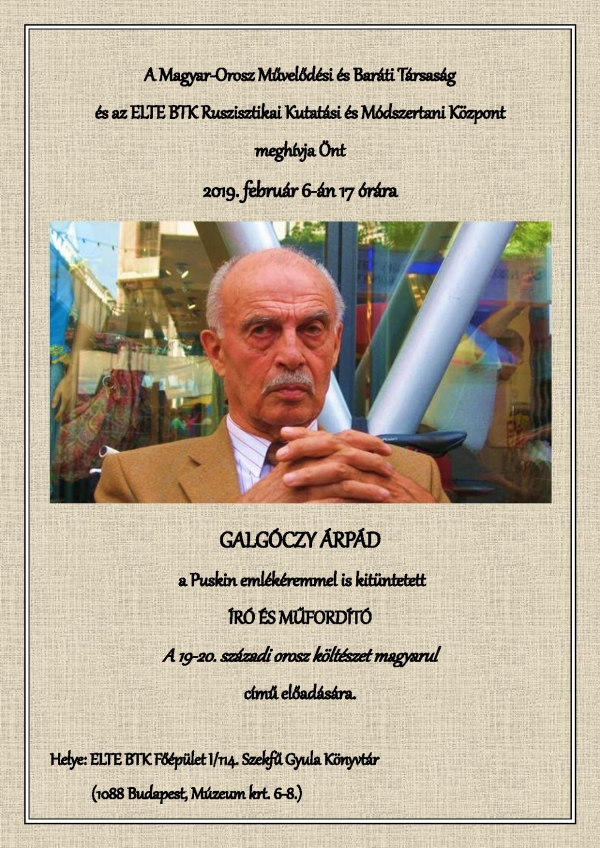 2019. február 6-án 17 órától a 90 éves Galgóczy Árpád tart kihagyhatatlan előadást az ELTE BTK Történeti Intézet Szekfű Gyula Könyvtárában a klasszikus orosz költészet és a magyar műfordítás szépségeiről és rejtelmeiről.