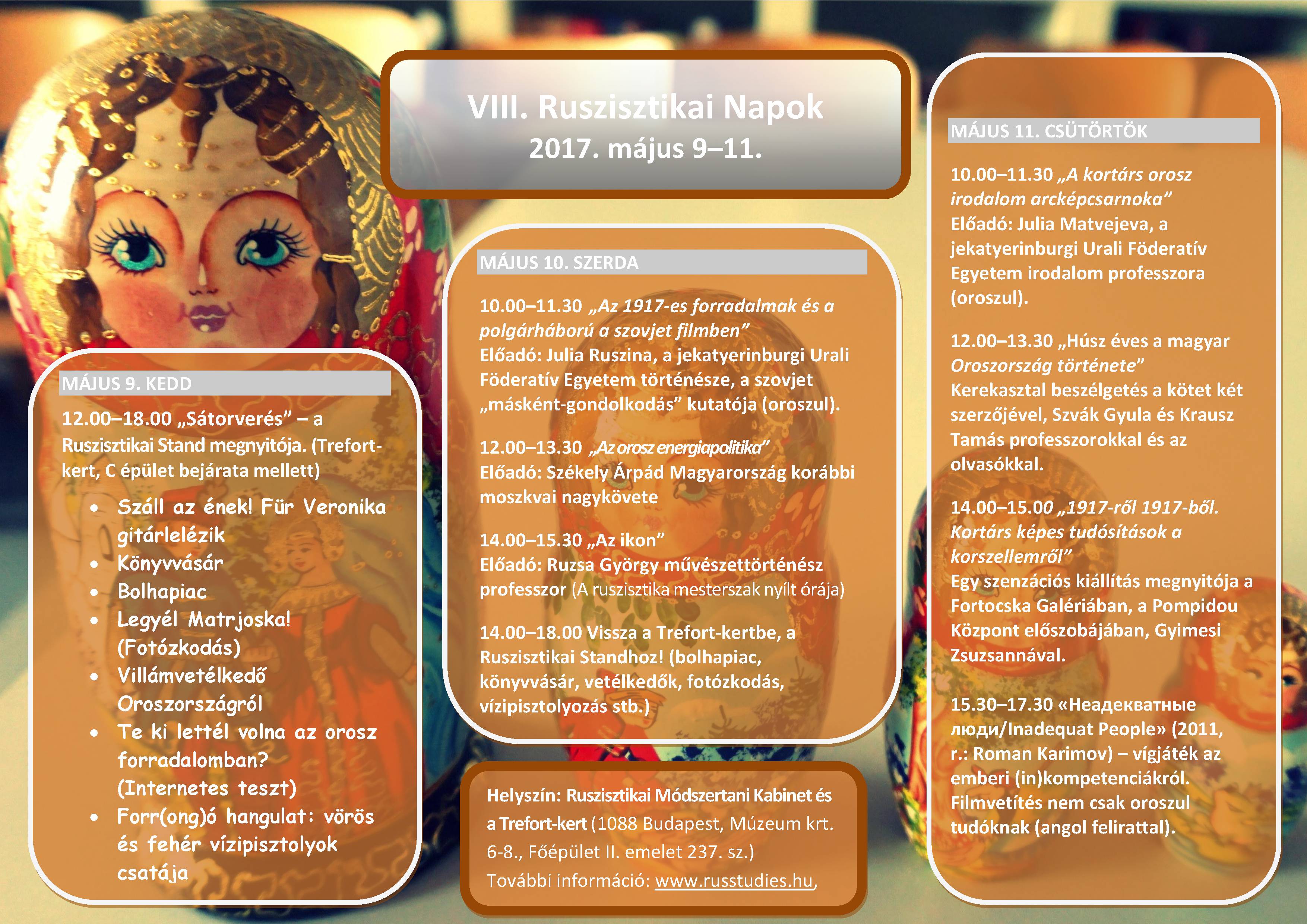 A hagyományoknak megfelelően a három napos programsorozat a Ruszisztikai Kabinetben (Főépület II. emelet 237. szoba), a kabinet előtt elhelyezkedő Fortocska Galériában és a bölcsészkar udvarán, a  Trefort –kertben zajlik le.