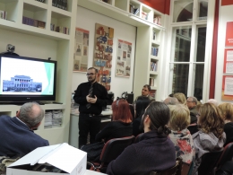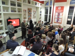Az ünnepség második felvonásában könyvkóstolgatásra került sor, ami nem csak a megnevezésében hordozott meglepetést. Szvák Gyula „Mi az orosz” című friss kötetében több mint harminc egykori hallgatója szemináriumi dolgozataiból is idéz. Ezek közül néhány kiemelkedően izgalmas részlet felolvasásra került, azzal a reménnyel, hogy a közönség soraiban ülők esetleg ráismernek egykori szövegükre. És igen, többen saját szavaikra ismertek, még ha bizonytalankodások közepette is. Krausz Tamás professzor a rendkívül egyszerű, ám gyakorlatilag megválaszolhatatlan kérdést (Mi az orosz?) körbe járó kötet egyik legnagyobb érdemeként azt emelte ki, hogy nem válaszadásra törekszik, hanem további felmerülő kérdésekkel és problémakörökkel szembesíti az olvasót. A szerző egymás mellett sorakoztatja fel komoly történészek koncepcióit, közvélemény kutatások eredményeit, alap-és mesterszakos egyetemi hallgatók véleményét, precízen leképezve a kérdéssel foglalkozó véleményalkotók és véleményformálók összetételét. A kötet abból a szempontból is hidat képezett a hallgatói és kutatói stációk között, hogy Farkas Ádám egykori írásrészlete is szerepel benne. Újabb bizonyíték arra, hogy az egyetemen érdemes minden helyzetben jól dolgozni, hiszen nem várt kifutása lehet a befektetett energiának: például (részleges) publikálásra kerül egy szemináriumi dolgozat.