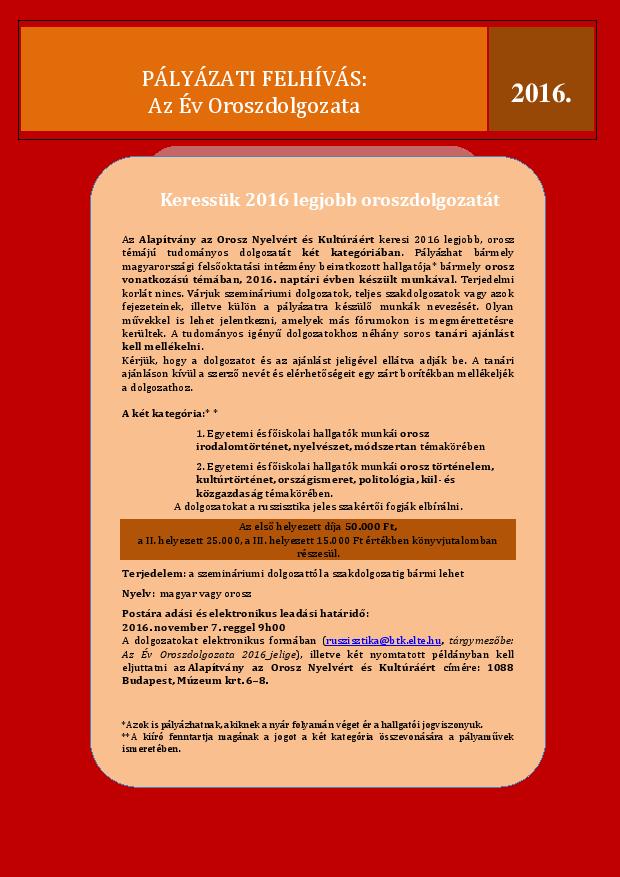 Idén tizedik alkalommal kerül meghirdetésre Az Év Oroszdolgozata című pályázat. Szemináriumi dolgozatokkal, szakdolgozatokkal vagy azok fejezeteivel, diákköri dolgozatokkal vagy külön a pályázatra írt anyaggal lehet pályázni – akár már most. A végleges leadási határidő 2016. november 7.