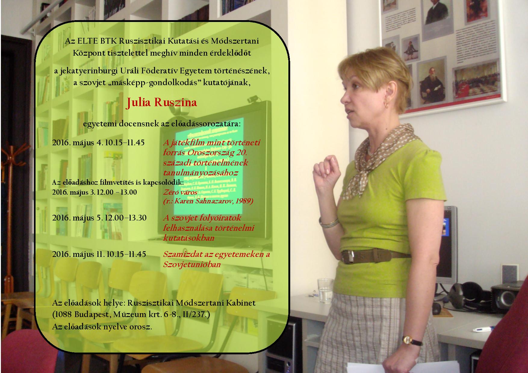 Julia Ruszina történész, az Urali Föderatív Egyetem docense, a tavalyi nagy sikerre való tekintettel idén ismét mesterkurzust tart az ELTE BTK Ruszisztikai Központban 2016. május 3–12. között.