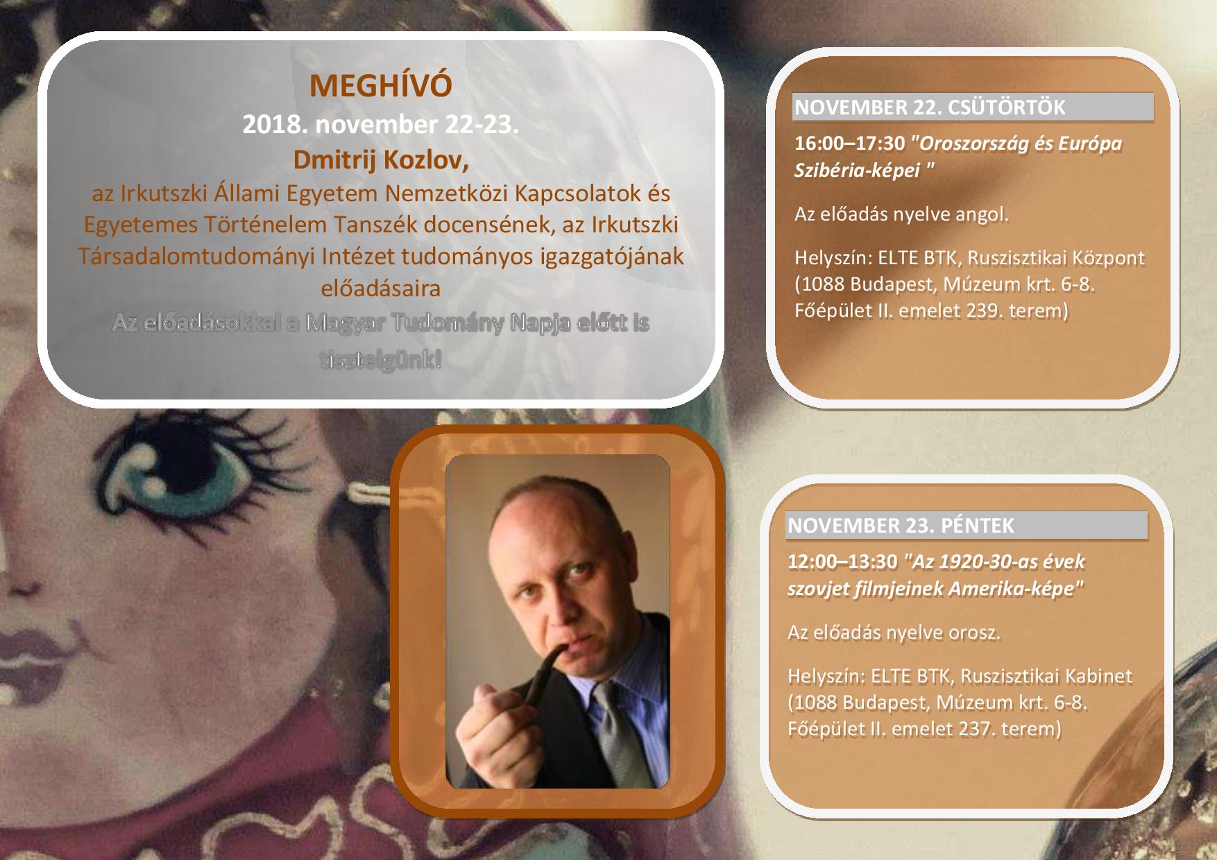Dmitrij Kozlov tudományos kapcsolatok felvétele céljából érkezik Magyarországra, és rögtön két előadással is megalapozza a Ruszisztikai Központtal kibontakozó jó viszonyt. November 22-én 16 órától Oroszország és Európa Szibéria-képeiről tart előadást angol nyelven a Főépület 239-es szobájában, míg november 23-án 12 órától a Ruszisztikai Kabinetben fog beszélni az 1920-30-as évek szovjet filmjeinek Amerika-képéről orosz nyelven.