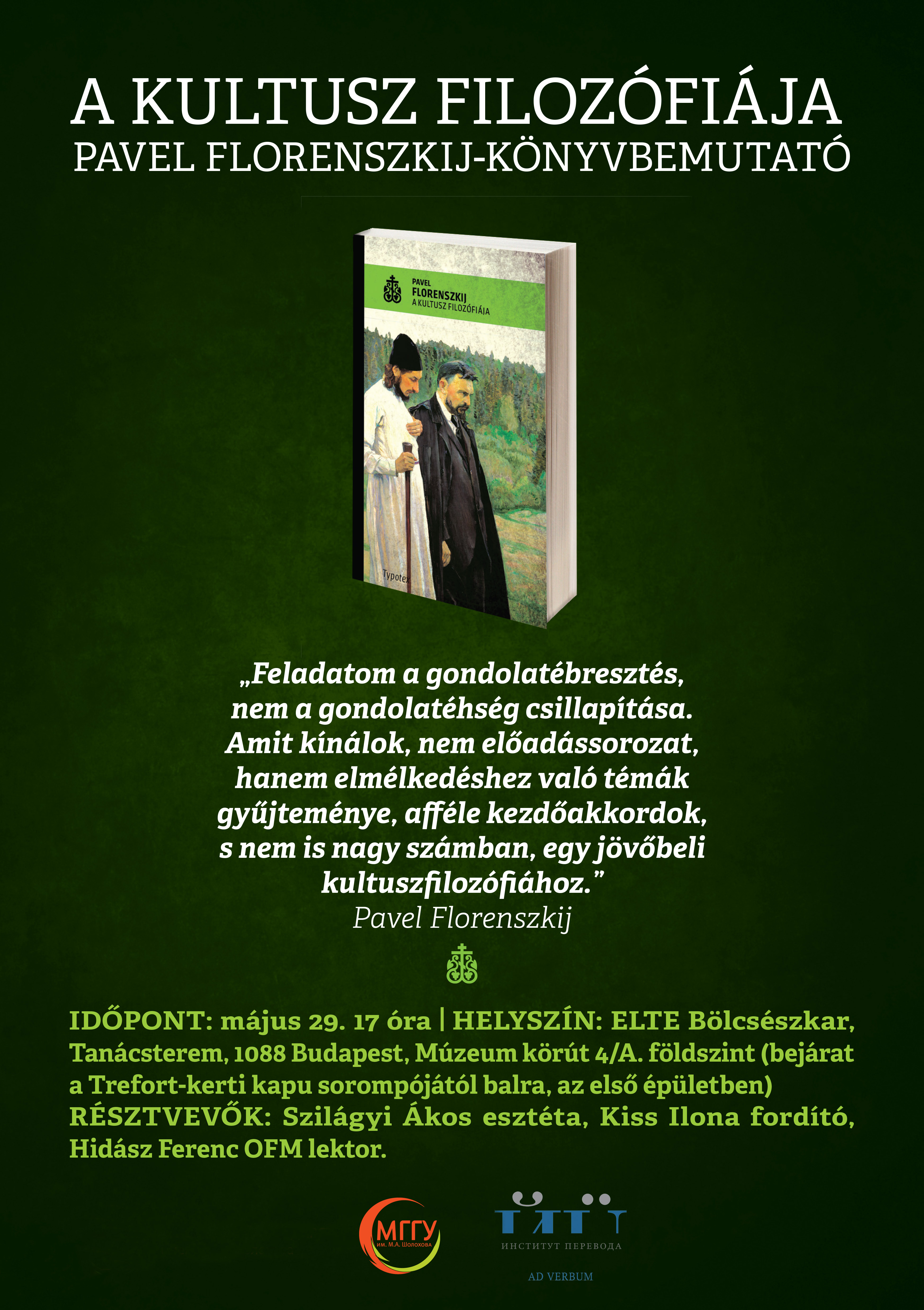 A XIX–XX. századának kiemelkedő orosz filozófusa, teológusa, matematikusa, Pavel Florenszkij jelentős művei közül Az ikonosztáz már két kiadást megért magyar fordításban (1988, 2005). Mostantól A kultusz filozófiája című kötete is olvasható magyarul Kiss Ilona fordításában, a Typotex kiadásában. A kötet bemutatójára 2015. május 29-én 17 órakor kerül sor az ELTE BTK Kari Tanácstermében.