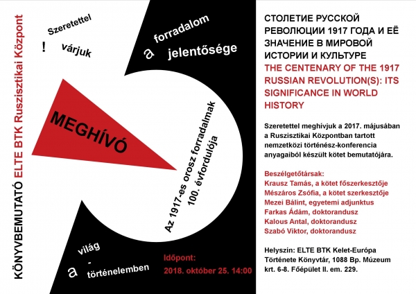 2018. október 25-én 14 órakor könyvbemutató lesz az ELTE BTK Kelet-Európa Története Tanszék könyvtárában. Bemutatásra kerül az 1917-es oroszországi forradalmak 100. évfordulója alkalmából rendezett nemzetközi történeti ruszisztikai konferencia előadásaiból szerkesztett kötet, a Ruszisztikai Könyvek XLV. tagja.