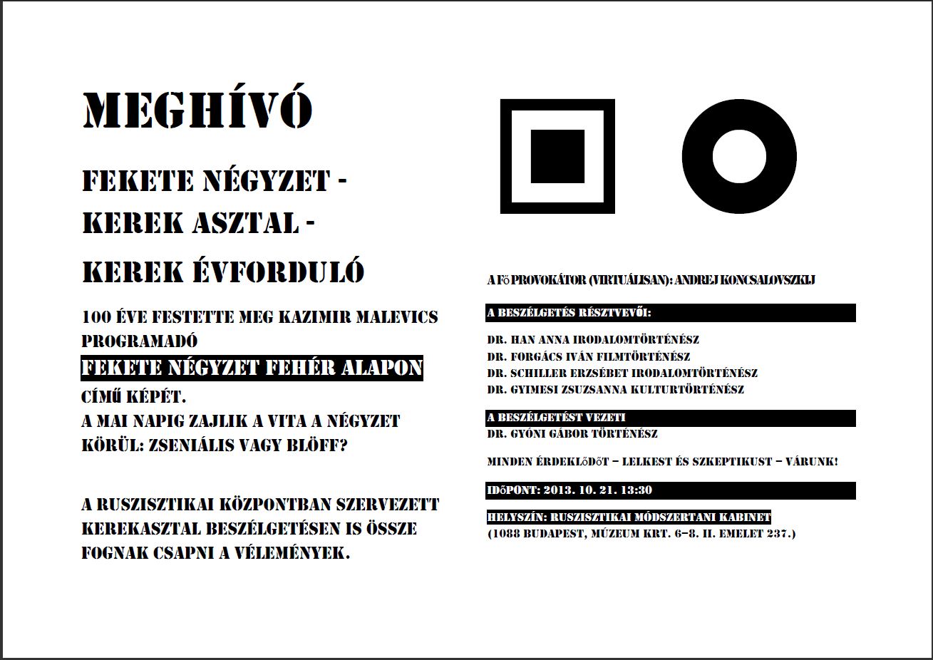 A Ruszisztikai Központ kerekasztal beszélgetést szervez a kerek évfoduló kapcsán a fekete négyzetről, illetve Andrej Koncsalovszkij ehhez kapcsolódó előadásáról (ami interneten megtekinthető).