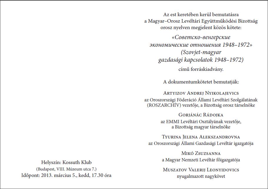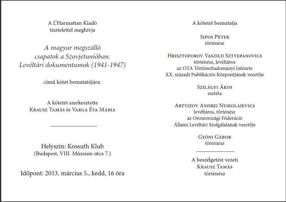 Könyvbemutatóra invitálunk minden kedves érdeklődőt 2013. március 5-én 16 órától a Kossuth Klubba (Budapest VIII. kerület, Múzeum utca 7.).