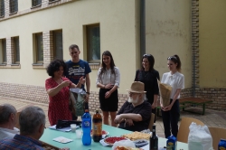 A hangulat felszabadult, vidám, időnként nosztalgikus volt. A felszabadultság abból fakadt, hogy a ruszisztika végzős hallgatói délelőtt sikeresen államvizsgáztak, megvédték szakdolgozatukat, és most megünnepeltük sikereiket, az együtt eltöltött két évet. Oktatóink, mesterszakos- és doktorandusz-hallgatóink finomabbnál finomabb sütemények mellett osztották meg egymással az elmúlt év élményeit, örömöt, bánatot, hullámhegyeket és hullámvölgyeket, és természetesen a jövőre vonatkozó reményeket és célokat. Az évet sikeresen zártuk le, a dínomdánom egészen estig tartott!
