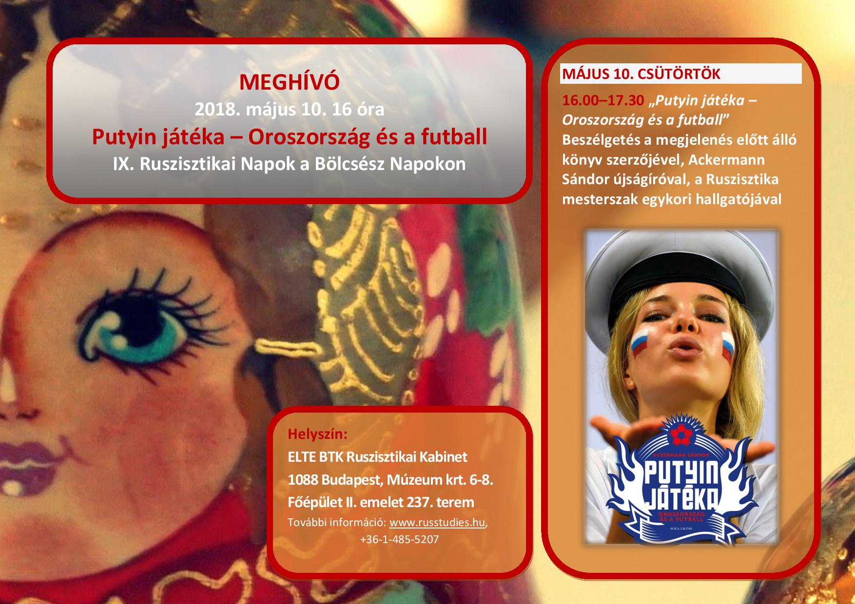 2018. május 10-én csütörtökön 16 órától a ruszisztika mesterszak korábbi hallgatója, Ackermann Sándor  újságíró lesz a Ruszisztikai Központ vendége. Ezúttal nem alumnusaként, hanem újságíróként és könyvszerzőként fog fellépni: hamarosan megjelenő első könyvéről, a "Putyin játéka – Oroszország és a futball"-ról fogunk vele beszélgetni.