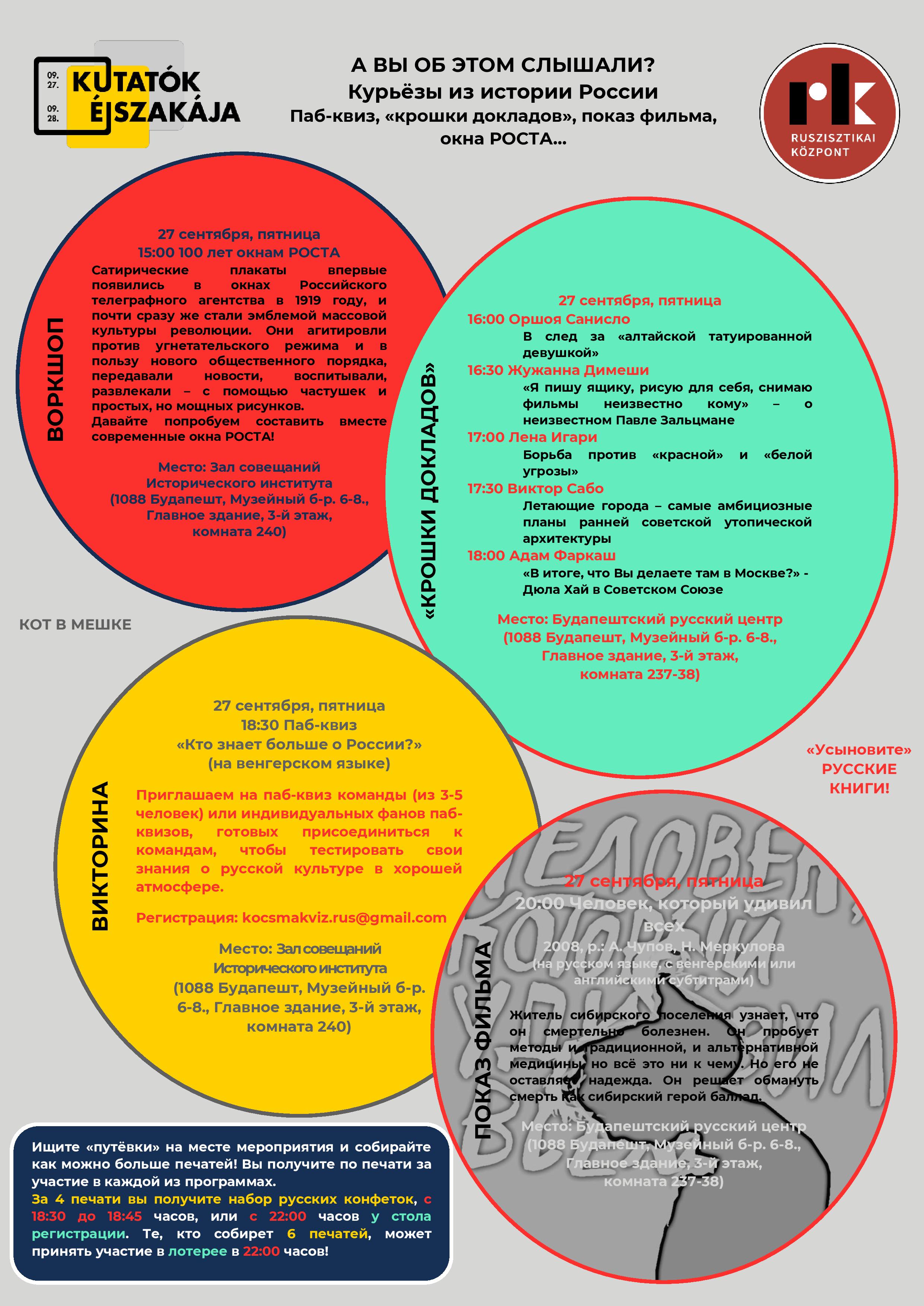 27 сентября 2019 года опять наступает Ночь исследователей по всей Венгрии. Центр русистики тоже открывает свои двери перед всеми, кому не хочется спать и кто готов развлекаться в науно-исследовательских обстоятельствах. Воркшоп, лекции-крожки, кино, паб-квиз, лотерея!