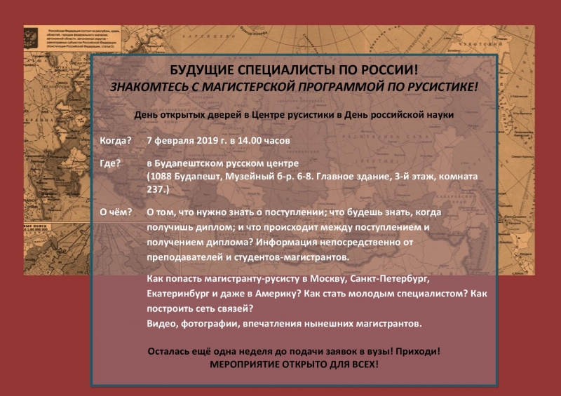 7 февраля 2019 года в 14.00 часов в Будапештском Центре русистики отмечается российский День науки Днем открытых дверей для будуших студентов-магистрантов по исторической русистике.