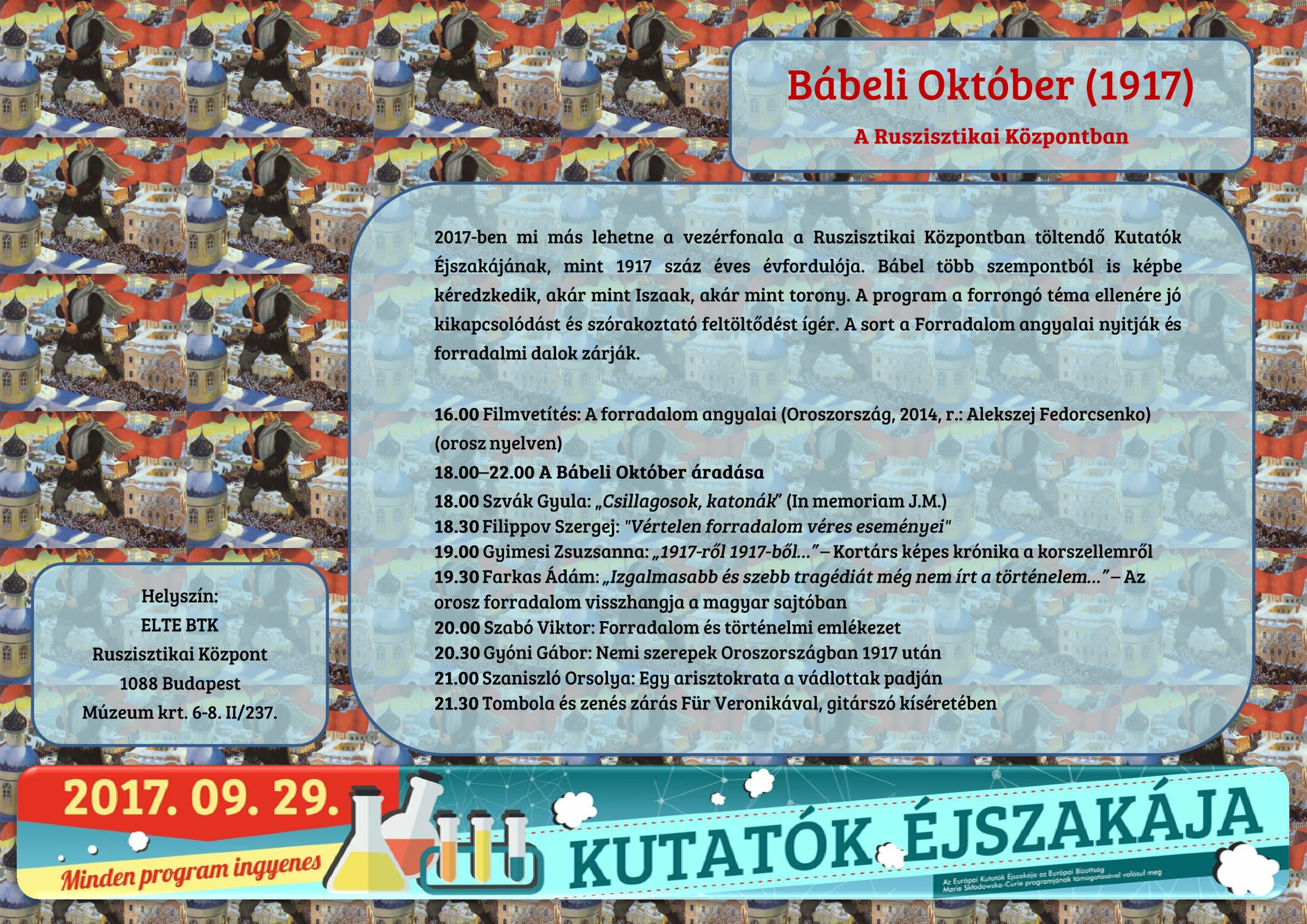 2017. szeptember 29-én,  a Kutatók Éjszakáján minden érdeklődő megtapasztalhatja a száz évvel ezelőtti "Bábeli Október" hangulatát, ha eljön a Ruszisztikai Központba.