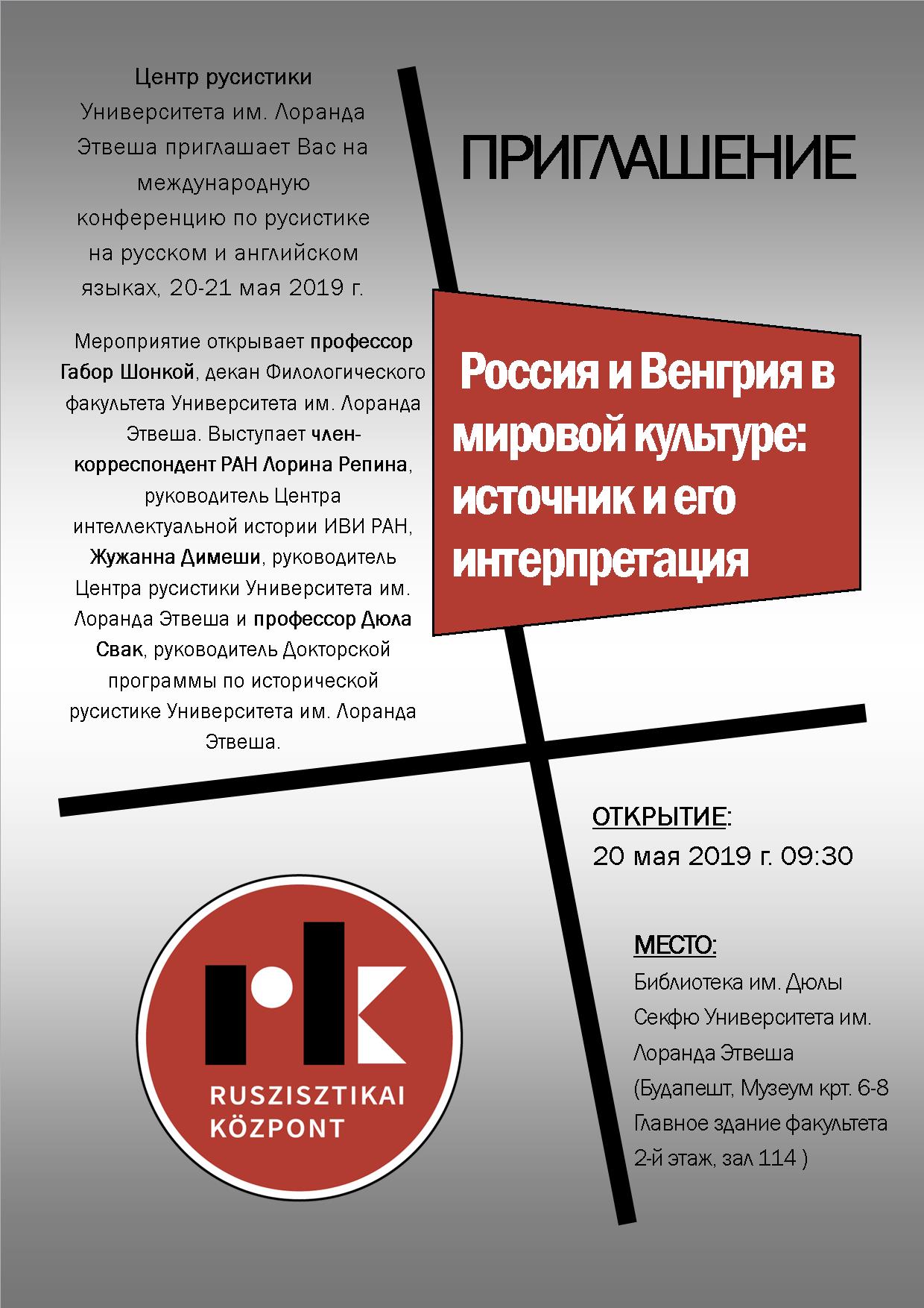 20–21 мая 2019 года состоится 12-я международная конференция по русистике в широком смысле в Будапештском Центре русистики. Конференция называется "Россия и Венгрия в мировой культуре: источник и его интерпретация".