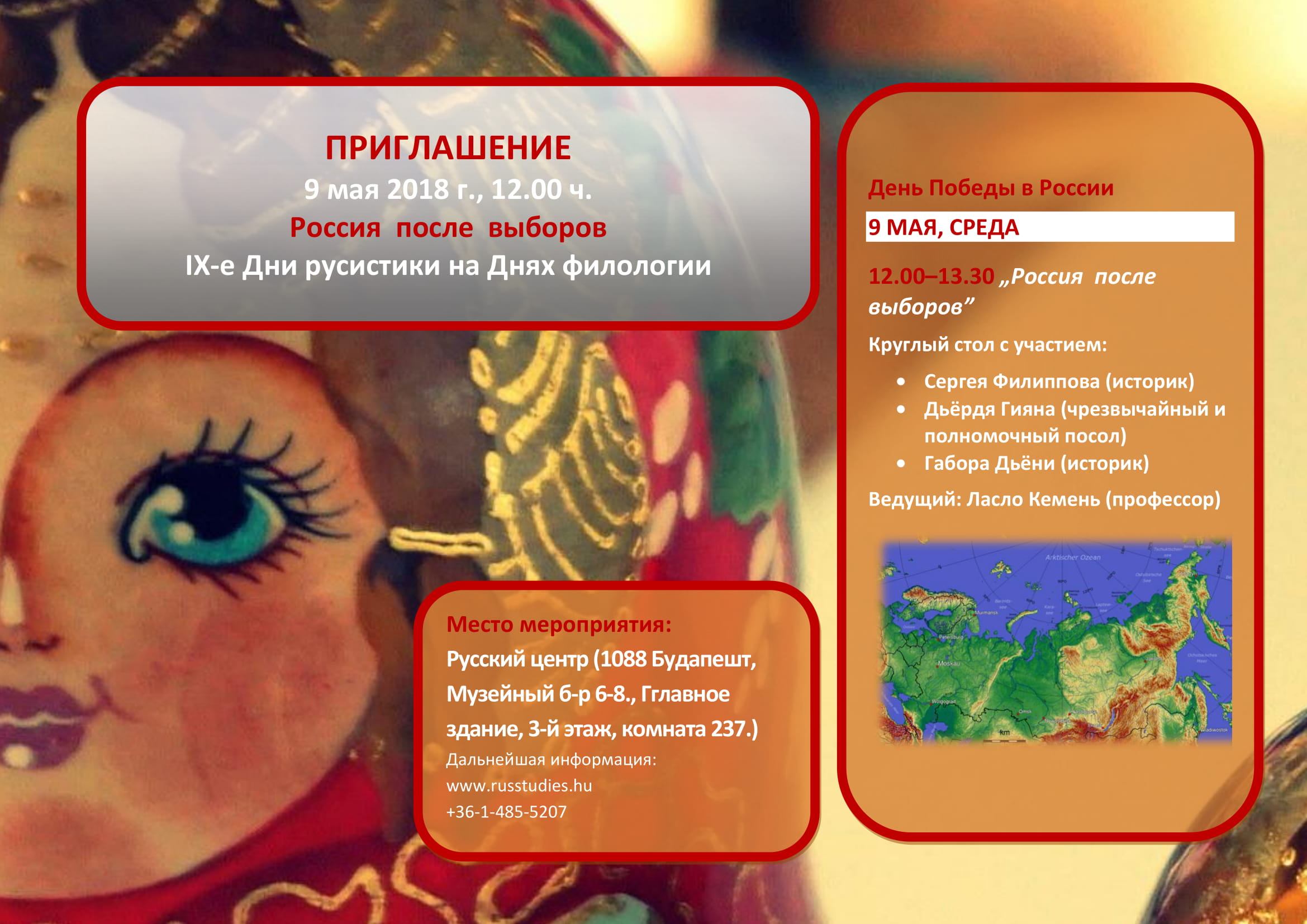 9 мая 2018 года в 12 часов состоится круглый стол о России после выборов в Будапештском русском центре, в рамках IX-x Дней русистики. Вход свободный.