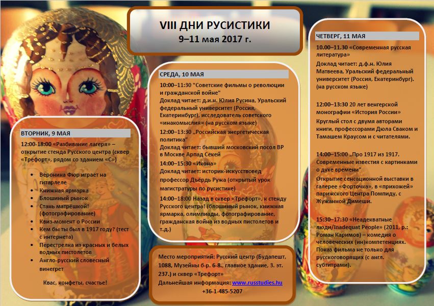 С 9 по 11 мая 2017 года будут проходить VIII Дни русистики. Это мероприятие начиная с 2010 года является одним из самых значимых среди серии мероприятий «Дни филологии» Историко-филологического факультета Университета им. Лоранда Этвеша.
