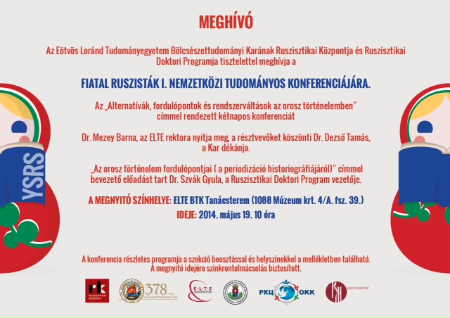 19–20 мая 2014 г. состоится Первая международная научная конференция молодых русистов. Работа конференции будет проходить в 5 секциях, с участием 64 докладчиков из 12 стран. Организатор конференции – Центр русистики при ЭЛТЕ. Места мероприятий указаны в программе.