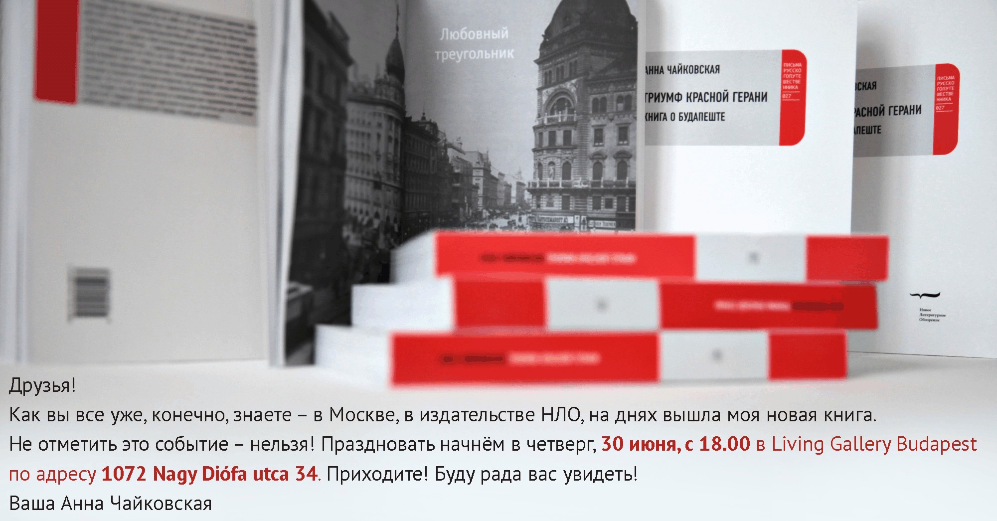 Anna Csajkovszkaja neve ismerősen cseng a Ruszisztikai Központban. Előadások, kiállítás és egyedi műtárgy fűződik a nevéhez és a kezéhez, ami a ruszisztikai programok krónikáját gyarapítja. Most orosz nyelvű könyve jelent meg Budapestről "A piros muskátli diadala: könyv Budapestről" címmel.