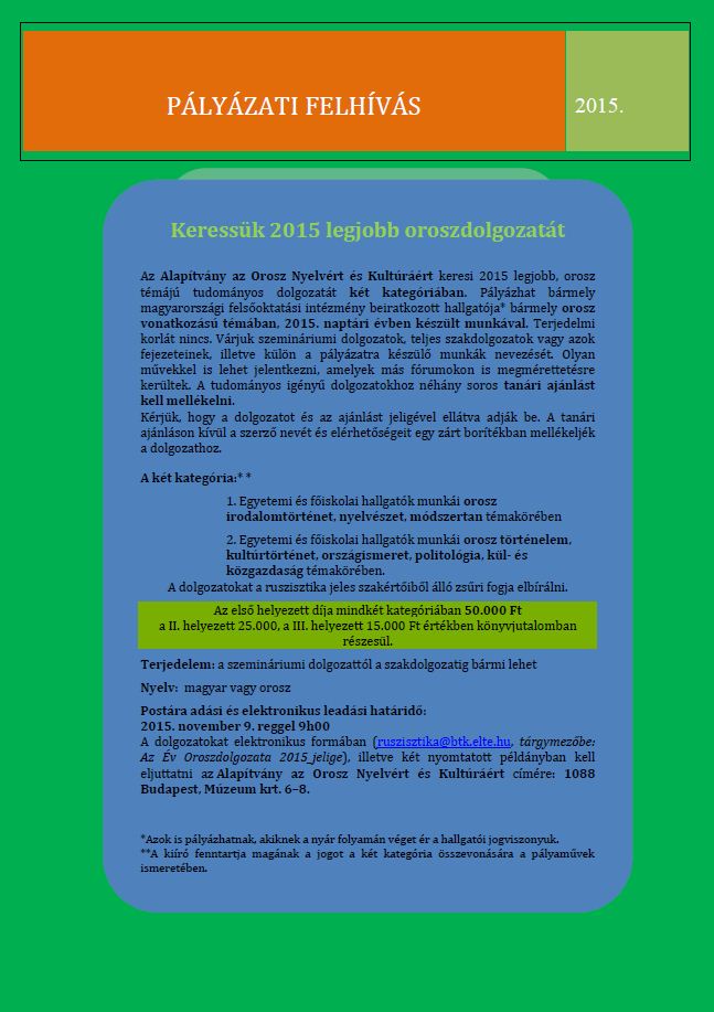 Idén kilencedik alkalommal kerül meghirdetésre Az Év Oroszdolgozata című pályázat. Szemináriumi dolgozatokkal, szakdolgozatokkal vagy azok fejezeteivel, diákköri dolgozatokkal is lehet pályázni már most. A végleges leadási határidő 2015. november 9.