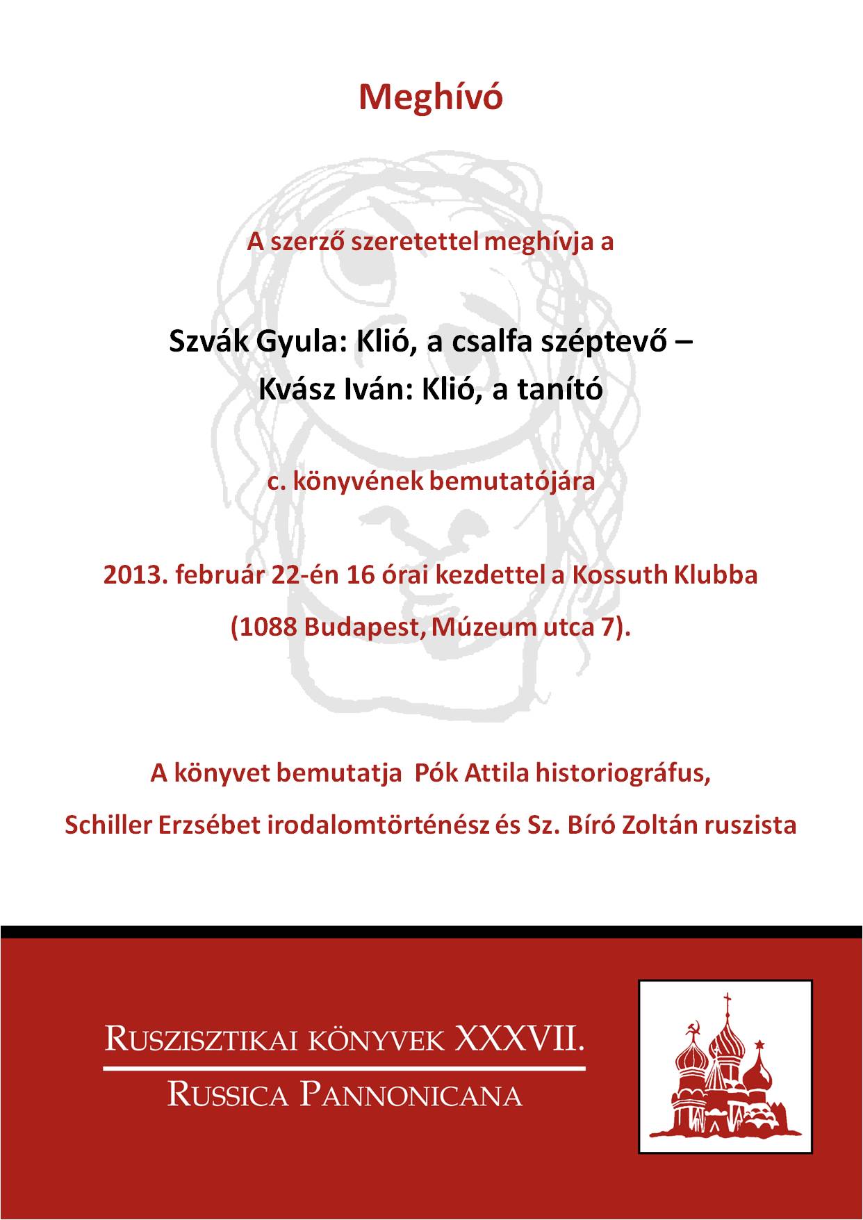 Megjelent a Ruszisztikai Könyvek sorozat XXXVII. tagja, amelynek bemutatójára 2013. február 22-én 16 órakor kerül sor a Kossuth Klubban. A ránézésre két szerzős kötet rendhagyó műfaji változatosságot mutat. A rejtélyekre fény fog derülni, ha eljönnek a könyvbemutatóra és ha kezükbe veszik a kötetet.