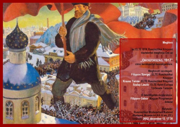 Az ELTE BTK Ruszisztikai Központjának idei utolsó történész kerekasztal beszélgetésére 2012. december 12-én 17.30-kor kerül sor a Ruszisztikai Kabinetben. A témát az 1917-es oroszországi események adják, a moderátor Filippov Gábor lesz a Magyar Progresszív Intézetből.
