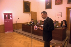 Minden évben izgalommal várjuk, vajon megtelik-e a Kari Tanácsterem a díjátadó ünnepségen, hiszen – valljuk be – kétséges műfajról van szó. Aki érintett, az előtt a díjakat próbáljuk titokban tartani, aki nem érintett, az miért jöjjön el? Szerencsére azonban idén is száz fölött volt azoknak a száma, akik, ha nem is közvetlenül, mégis érintve érezték magukat és kíváncsian vagy már eleve örömmel jöttek el, hogy tanúi lehessenek a díjazottak örömének. Pedig konkurens eseményekben nem volt hiány. Ugyanebben az időpontban a Művészetek Palotájában a Szentpétervári Filharmonikus Zenekar lépett fel, a szomszédban pedig, a Petőfi Irodalmi Múzeumban, Nádas Péter tartott szubjektív tárlatvezetést a saját fotóiból rendezett kiállításon.