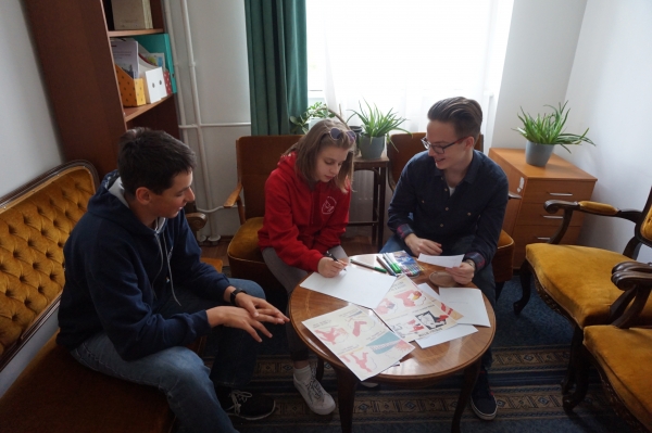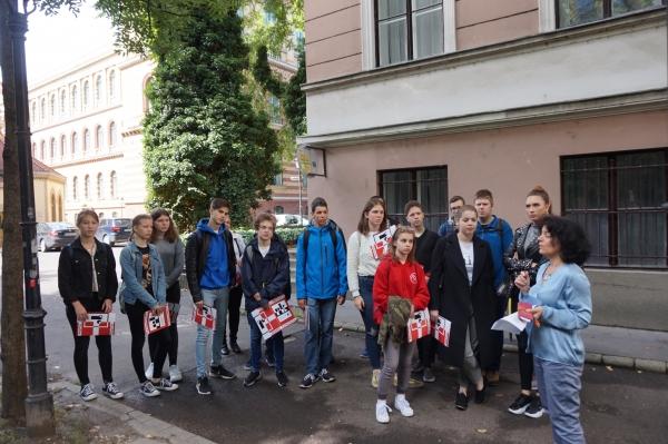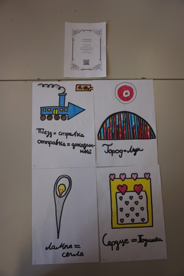 A program során 17 gimnazista érkezett hozzánk Ferschné Várnai Tímea tanárnő vezetésével. Először a Trefort-kertben tettünk egy rövid sétát, ahol a diákok aktív közreműködésével derült fény a környező épületek és emlékművek történetére. Ezután bemutattuk a Ruszisztikai Kabinetet, majd feltártuk a Fortocska Galéria legújabb plakátkiállításának rejtelmeit. A tízórait kocsmakvízzel kötöttük egybe, ahol a fiatalok alkoholos italok helyett kvásszal és teával olthatták szomjukat, miközben azt találgatták, hogy milyen ételt esznek Oroszországban a nagyböjt kezdete előtt, vagy hova is mennek az oroszok, amikor a „bányába” készülnek. Végül a ROSZTA-ablakok 100. évfordulójára és a küszöbön álló orosz nyelv napjára emlékezve arra kértük a gimnazistákat, hogy egy általuk kiválasztott orosz versről készítsenek plakátot ROSZTA-stílusban. Az eredménynek csodájára lehetett járni, a plakátok olyan szépek, izgalmasak, kreatívak lettek. Várakozásainkkal ellentétben a fiatalok nem azokat a verseket választották, amiket első látásra könnyebb lett volna illusztrálni, hanem komoly, elvont művek költői képeit jelenítettek meg vizuálisan, méghozzá nagy sikerrel.