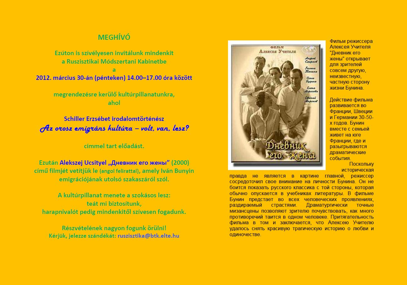 A Ruszisztikai Központ márciusi kultúrpillanatait március 30-án 14 órától az emigráns orosz kultúra vizsgálatának szenteljük, Dr. Schiller Erzsébet irodalomtörténész vezetésével.