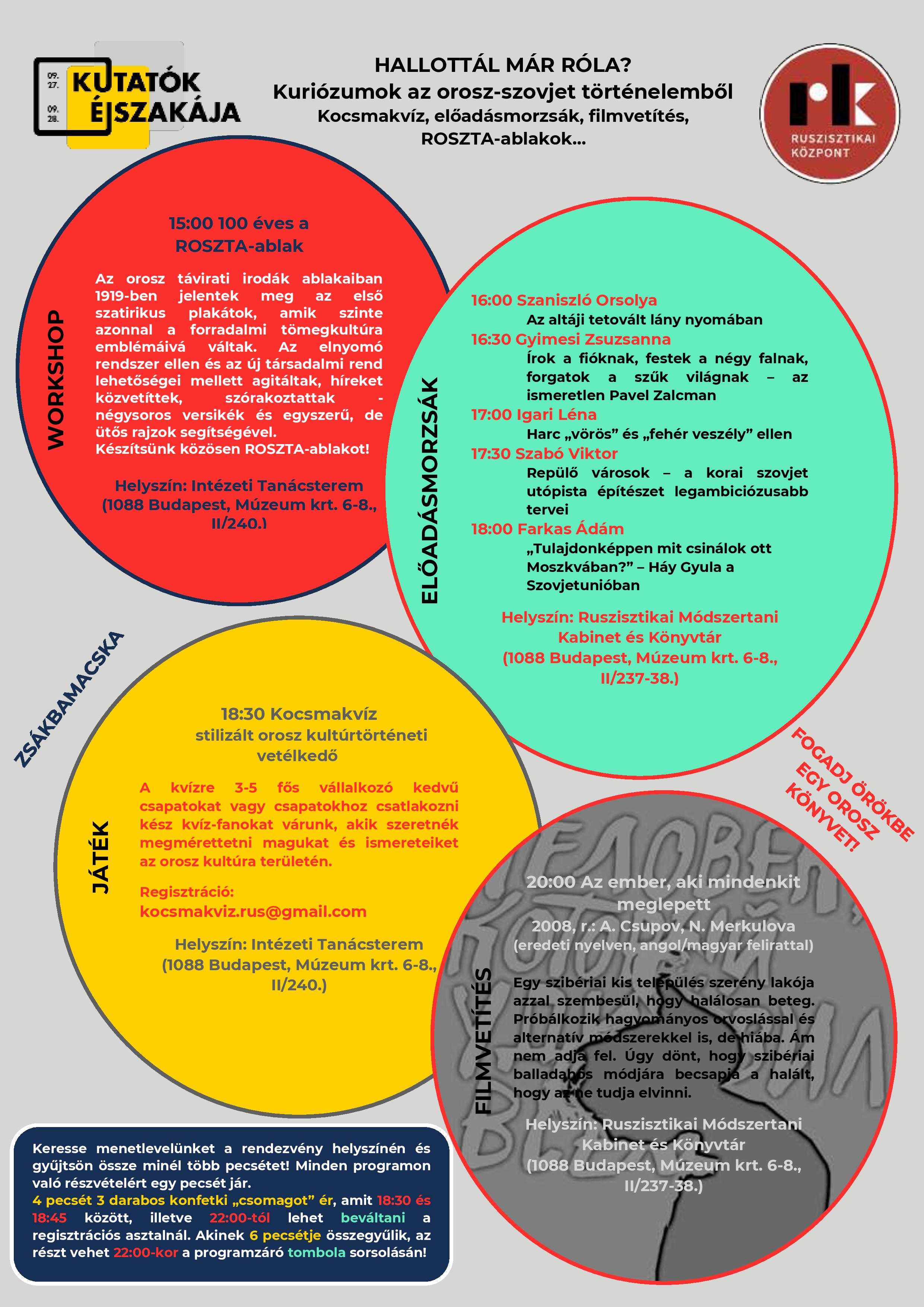 Nyilván már hallottatok róla, hogy a Ruszisztikai Központban mindig nagyszerű programok vannak a Kutatók Éjszakáján. Idén a programokat arra a kérdésre fűztük fel, hogy Hallottál már róla? Ha igen, gyere el, ha nem, akkor pedig azért gyere el szeptember 27-én! |